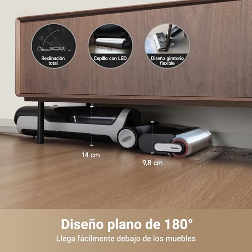 [Limpieza sin límites gracias a su alcance horizontal de 180º] :Gracias a su innovador diseño, la aspiradora H14 Pro abarca toda la superficie del suelo, cabe en espacios de 14 cm de altura y el cabezal del cepillo puede alcanzar a espacios de tan solo 9,8 cm. Además, la tecnología Liquid Separation Motor mantiene el agua usada separada del motor cuando el dispositivo está en posición horizontal para garantizar el máximo rendimiento.