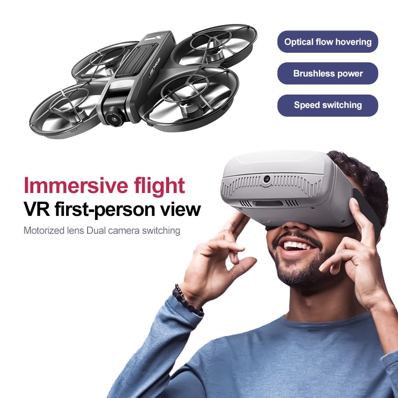 Drone con gafas de realidad virtual auriculares, vista en primera persona, cámara 1080P para principiantes FPV Quadcopter, giro de 360°, motor sin escobillas, flujo óptico flotante, control de