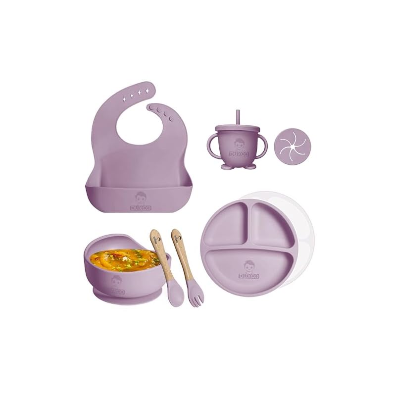 DUXCO Vajilla de Silicona para Bebé – set de 6 piezas – incluye juego de cubiertos infantil, plato con ventosa antideslizante y babero impermeable exclusivamente para tu bebé. (Violeta)