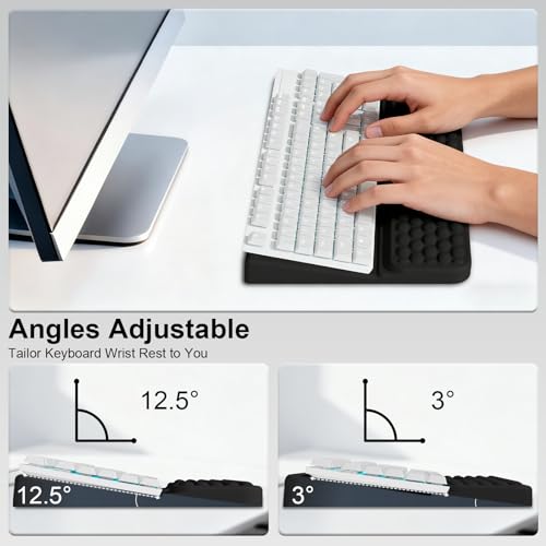 Ergonomic Keyboard Stand: This tilted computer keyboard stand with 2-level height adjustment elevates your keyboard to an ergonomic angle and height.A 12.5° tilt reduces strain on tendons and joints during extended work sessions, while the 3° subtle elevation is ideal for quick tasks or casual use.You can adjust the keyboard’s position on the keyboard wrist rest according to your comfort, making typing much easier