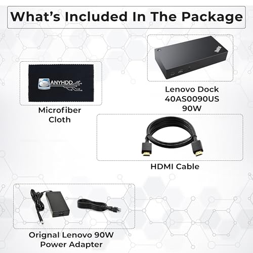 [El paquete incluye] – Base para laptop 40AS0090US renovada, adaptador de 90 W, 1 cable HDMI, paño de limpieza de microfibra
