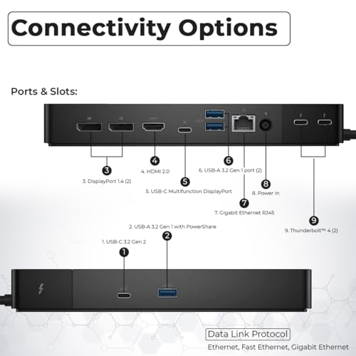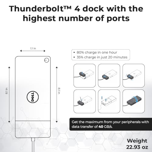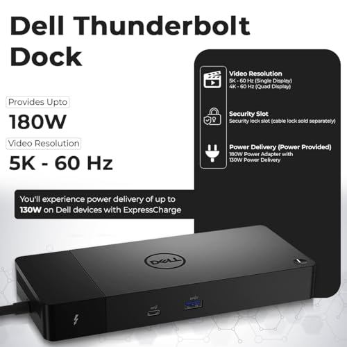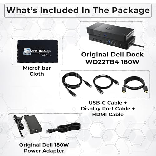 Especificaciones: Estación de acoplamiento Dell WD22TB4 Thunderbolt 4, adaptador de CA de 180 W, cable HDMI, cable DisplayPort, cable USB-C, estación de acoplamiento Dell (renovado)