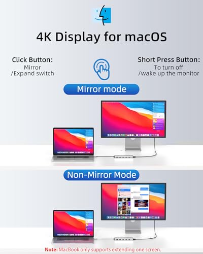 Estación de acoplamiento de triple pantalla: esta estación de acoplamiento USB C solo es compatible con sistema Windows MST y SST (modo espejo y extensión), puerto HDMI soporta hasta 4K @60Hz (fuente DP1.4); el puerto DP soporta hasta 4K @60Hz. Nota: para el modo de extensión, el sistema operativo MAC solo puede extender un monitor (4K @60Hz).