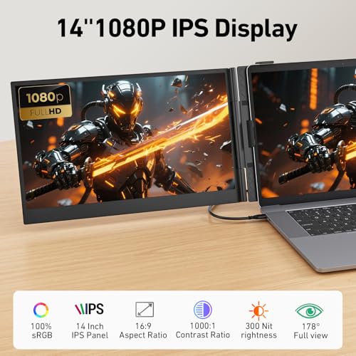Pantalla FHD nítida: experimenta impresionantes imágenes con este extensor de monitor de computadora portátil de triple pantalla. La pantalla IPS de 14 pulgadas ofrece una resolución vibrante de 1920 x 1080, brillo de 300 nits y una gama de colores NTSC del 72%. Con tecnología antirreflejos, cuidado de los ojos y un amplio ángulo de visión de 178°, este monitor portátil para portátil es perfecto para diseñadores, jugadores y uso en exteriores.