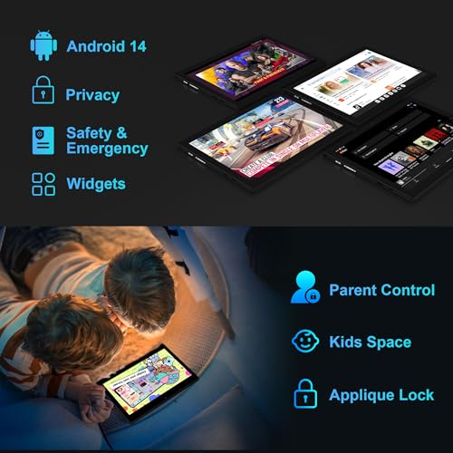 【Potente sistema Android 14】Las tabletas están equipadas con el potente y fácil de usar sistema operativo Android 14.La nueva función de privacidad protege sus datos personales. Con una visión clara y completa del tiempo que la aplicación puede acceder a su ubicación, cámara o microphone.thanks a la interfaz sencilla y rápida operación, usted puede manejar fácilmente sus películas, fotos, videos, música y más.