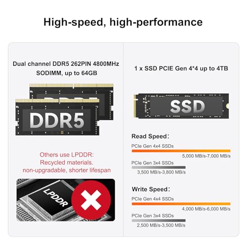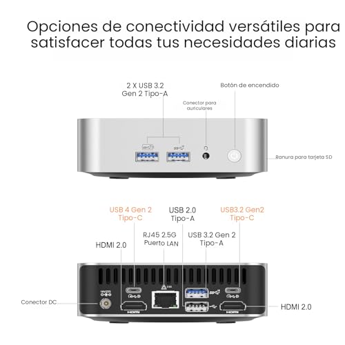 Memoria y almacenamiento increíblemente rápidos: equipada con 32 GB de RAM DDR5 y SSD PCIe Gen4 NVMe de 1 TB, además de una ranura SSD SATA M.2 2242 (2 TB), la mini PC de escritorio A6 garantiza una multitarea sin retrasos y un acceso rápido a los datos. Almacena miles de fotos, pistas de música o horas de video HD. Esta potente combinación es perfecta tanto para cargas de trabajo profesionales como para colecciones de medios personales.