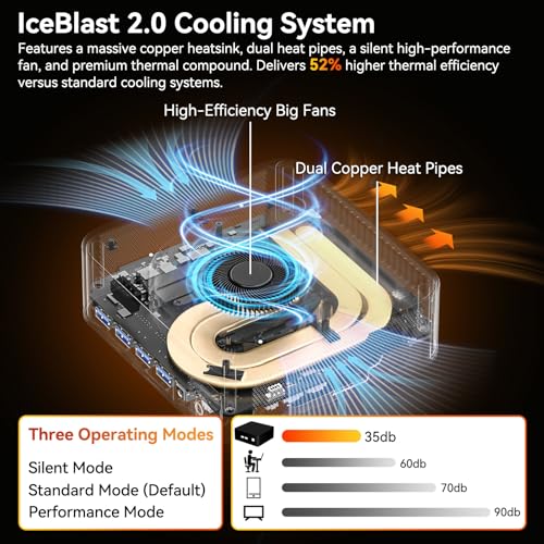 Refrigeración IceBlast 2.0 de grado profesional: la mini computadora de escritorio A9 Max se mantiene fría bajo presión con nuestro sistema térmico IceBlast 2.0 de grado profesional, con un disipador térmico de cobre de gran tamaño, tubos de enardecimiento duales y un ventilador silencioso de alto rendimiento. El flujo de aire diseñado con precisión con entrada lateral y rejillas de escape traseras mantiene las temperaturas bajo control, mientras que los compuestos térmicos premium garantizan una transferencia de enardecimiento óptima. Ya sea que estés pasando por sesiones de juego de maratón o cargas de trabajo creativas pesadas, esta solución de refrigeración inteligente evita el sobrecalentamiento y la aceleración térmica, ofreciendo un rendimiento máximo sostenido cuando más lo necesitas.