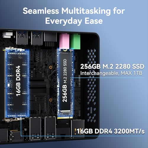 [8GB de Memoria Rápida y 256GB SSD] El micro PC Air12 Lite está equipado con 8GB de memoria DDR4 de canal único, capaz de alcanzar velocidades de hasta 3200MT/s, con soporte para expansión de hasta 16GB. Además, el GEEKOM mini PC de escritorio viene con un SSD estándar de 256GB que utiliza la interfaz M.2, soportando el estándar PCIe Gen3 con cuatro líneas de transferencia de datos, proporcionando almacenamiento de estado sólido de alta velocidad (ampliable hasta 1TB y compatible con SATA).