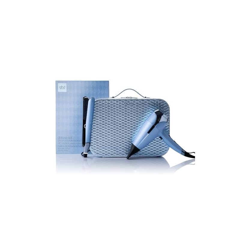 ghd deluxe Iced Luxe Collection – Cofre de regalo plancha de pelo chronos y secador de pelo profesional helios, edición limitada 2024, color azul gélido