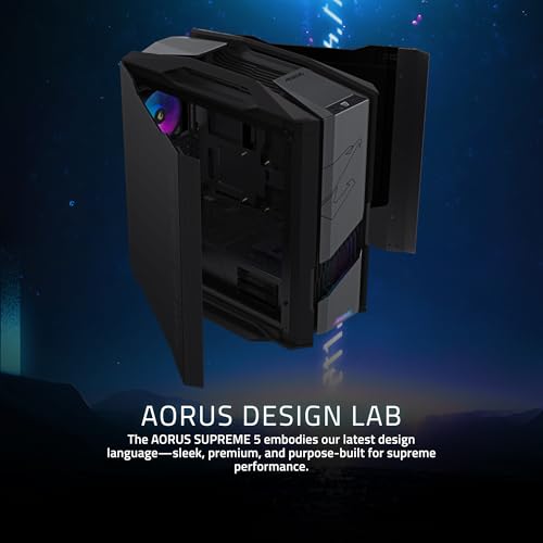 AORUS Design Lab – Caja de torre media elegante pero angular equipada con un panel lateral de vidrio templado.