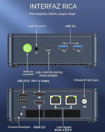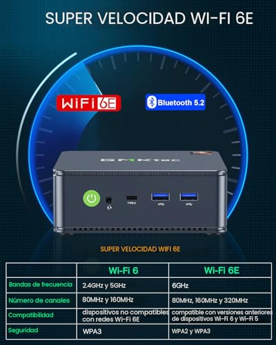 Conexión rápida WiFi 6E + BT5.2: GMKtec Mini PC con WiFi-6E inalámbrico, tiene banda triple de 2.5G/5G/6G, más rápida y menor latencia. Bluetooth 5.2 que le permite conectar más rápidamente otros dispositivos inalámbricos (auriculares, mouse, teclado, etc.) La interfaz cuenta con 2 puertos USB 3.2, 2 puertos USB2.0, 1 puerto HDMI 2.0 (4K @60 Hz), 1 puerto USB-C (PD/DP/DATA), 1 puerto DP, 1 puerto de audio de 0.138 in (HP y MIC), 1 puerto de alimentación de CC.