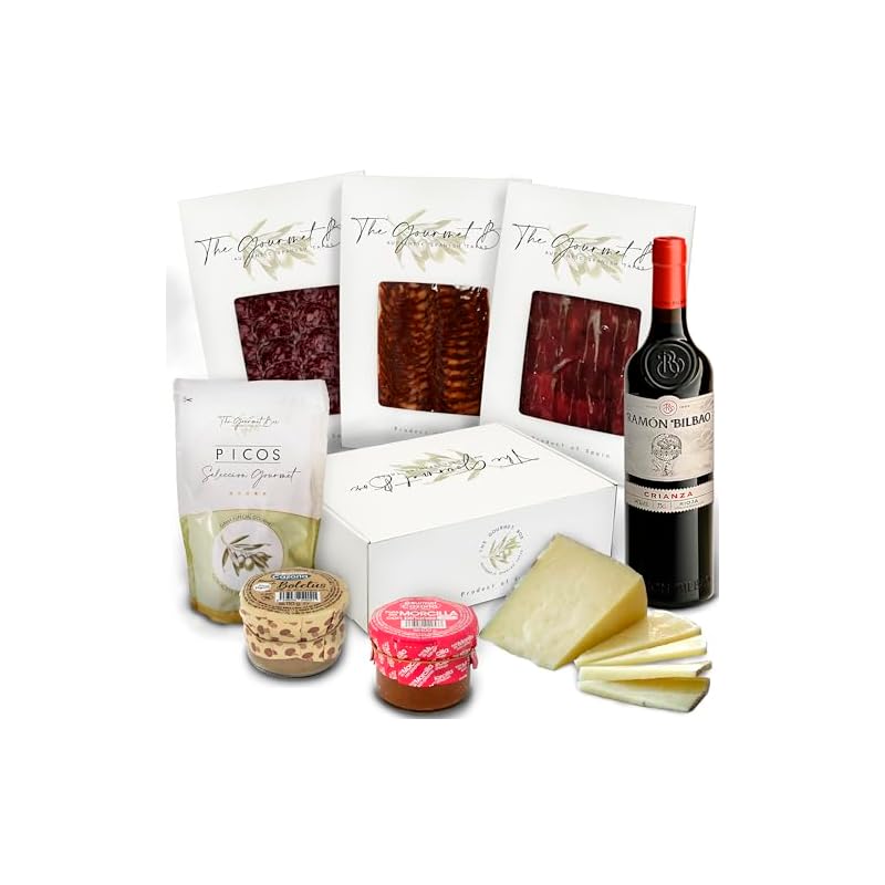 Especificaciones: GOURMET BOX | Cesta para Regalar | Jamon Selección Gourmet, Salchichon y Chorizo Iberico de bellota, Queso de Oveja 100%, Patés de Boletus y Morcilla, Picos Artesanos y Vino Ramon Bilbao
