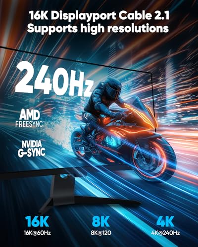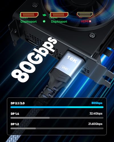 Especificaciones: Highwings Cable Displayport de 80Gbps 2.1 6.6 pies, 16K @60Hz, 8K @120Hz, 4K @240Hz, cable DP 2.1 trenzado de 16K, compatible con HDR10 DSC 1.2a, G-Sync FreeSync Gaming PC, monitor de juegos 5090, AMD