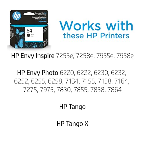 Especificaciones: HP Cartucho de tinta negra 64 | Funciona con HP ENVY Inspire 7950e; ENVY Photo 6200, 7100, 7800; Serie Tango | Elegible para Instant Ink | N9J90AN