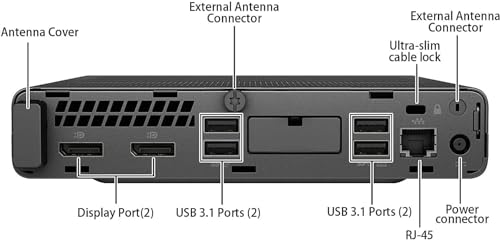 Reacondicionado HP EliteDesk 800 G4 Mini Business Desktop PC Puertos: 3x USB 3.1 Gen 1, 3x USB 3.1 Gen 2, 3x USB Type-C 3.1 Gen 2, 2x DisplayPort 1.2, 1x Front: Auriculares, 1x Frontal: Conector de audio universal con soporte para auriculares CTIA, 1xRJ-45