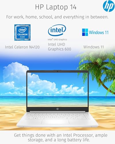 Especificaciones: HP Nuevo portátil ultraligero de alta definición de 14 pulgadas, procesador Intel Celeron de cuatro núcleos, 16 GB de RAM, 320 GB (64 GB eMMC+ 256 GB SD), Wi-Fi, hasta 11 horas, Windows 11 S + 1 año