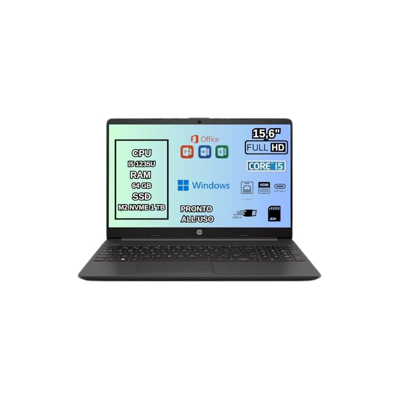 Especificaciones: HP Portátil 250 G9 – 15,6 pulgadas Fhd – Intel Core I5 1235u – RAM 64 GB Ddr4 – Ssd M.2 Nvme 1 Tb – Wi-Fi + Bt – Windows 11 Pro – Office 2021 – Ordenador portátil