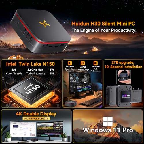 Huidun [3-Year Warranty] H30 Silent Mini PC N150 (Beat N97, Up to 3.6Ghz), 16GB RAM 512GB Mini Computers Win 11 Pro, Micro PC 4K Dual Display, USB3.2, Dual WiFi/BT/VESA Mount Mini Office PC