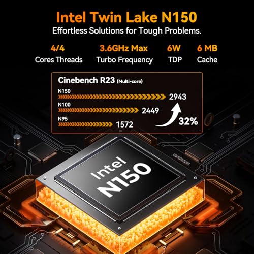 【High-performance 2025 N150 Powers UP】The Mini PC outperforms Alder Lake N100/N95/N97 with 39% higher Cinebench R23 scores and 23% GPU boost, effortlessly handling dual-screen workflows with N150 processor (4-core/4-thread, 6MB cache, 3.6GHz). Its 6W ultra-low power design (equivalent to 7V LED) streamlines heavy office tasks: processes 500-page PDFs and multi-thousand-line Excel formulas while maintaining smooth 4K video playback. Ideal for home entertainment, light gaming, and social media, this mini computer win 11 pro balances peak performance with energy efficiency.