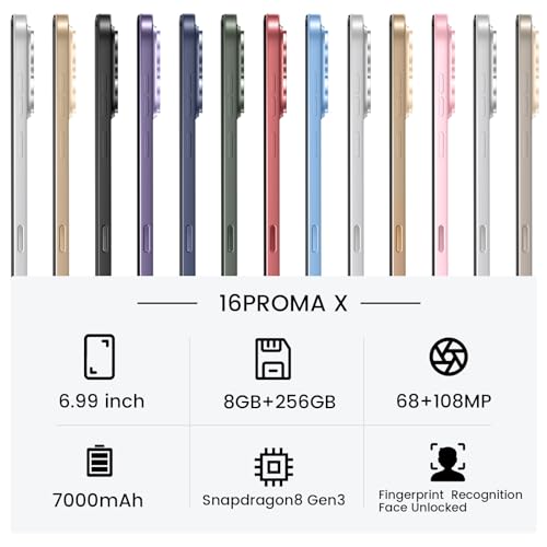 【6.99 HD + Android 13.0】 Este es un teléfono celular Android con una pantalla grande, pantalla HD + de 6.99 pulgadas, este teléfono Android 13.0 16PROMA X desbloqueado está equipado con una cámara principal de 108 MP y una cámara frontal de 68 MP, grabación mejor una vida hermosa y muestra tu belleza. Y tiene funciones de reconocimiento facial y desbloqueo de huellas dactilares de pantalla, que protegen eficazmente tu privacidad.