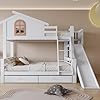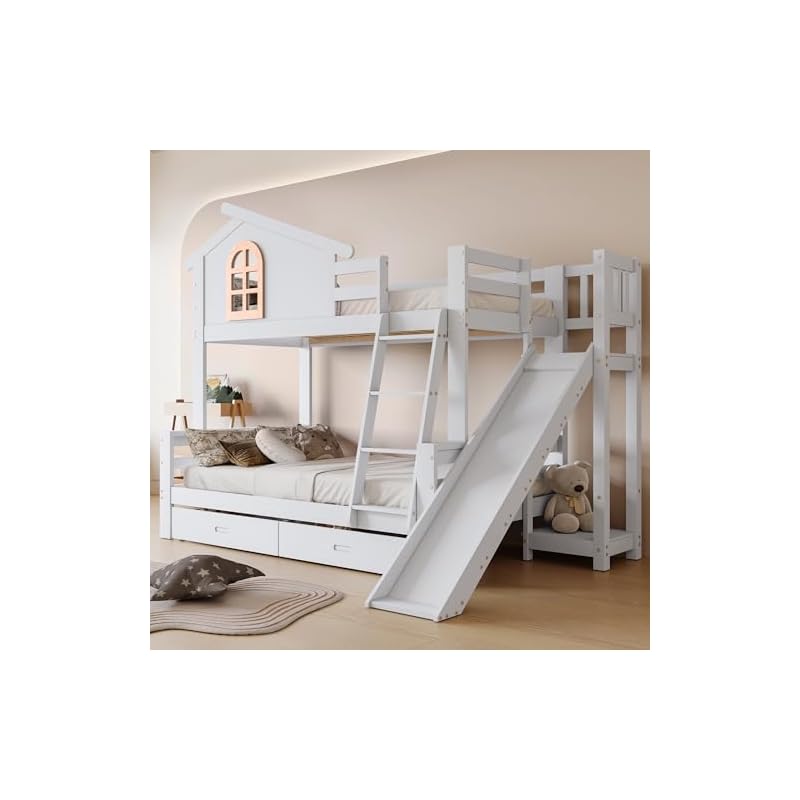 Especificaciones: Idemon Litera con ventanas y escalera basculante de cuatro niveles, cama infantil y cama madre con tobogán, con dos cajones, marco de cama de madera maciza, color blanco, 90 x 200 cm y 120 x 200 cm