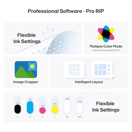 Fácil uso y mantenimiento: La DTF TransferPrinter está diseñada como una solución todo en uno, soporta todo el proceso, desde la creación de imágenes hasta la impresión en película. El sistema de tinta blanca de la máquina DTF incluye circulación automática y agitación para evitar la sedimentación y la obstrucción. Un sistema de filtración de sifón garantiza la pureza de la tinta y una distribución uniforme. La limpieza automática y un dispositivo de humidificación mantienen el cabezal de impresión en las mejores condiciones durante el tiempo de inactividad.