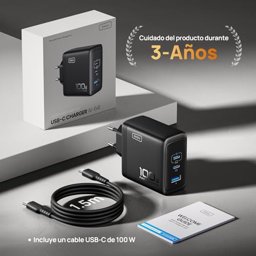 Especificaciones: INIU 100W Cargador USB C, GAN Ⅲ 3 Puertos Carga Rapida, PD QC Adaptador, Compacto y Ahorro de Espacio, Compatible con MacBook iPad Pro/Air, iPhone 16, Huawei, Samsung Galaxy S24 Ultra, Steam Deck