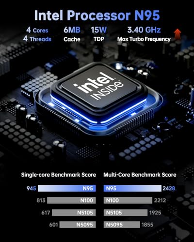 【Nuevo procesador N95 mejorado】La mini PC KAMRUI E1 funciona con el último procesador Alder Lake-N N95 de 2025 (hasta 3.4 GHz, 4 núcleos/4 hilos, caché L3 de 6 MB). En comparación con (N100/N5105/N5100/N5095), rendimiento de CPU +35%, GPU +75%, ya sea manejando multitarea en el trabajo, ejecutando reuniones HD sin problemas, transmisión de videos 4K o creación de contenido ligero, lo maneja todo con facilidad.