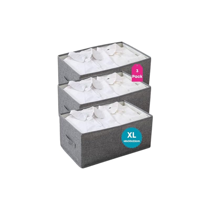 Especificaciones: KATTAO Set de 3 Cajas Organizadoras XL (48x30x22cm) Imitación Lino Gris – Organizador Armario Ropa – Caja Organizadora – Ideal como Organizador Cajones y Armarios