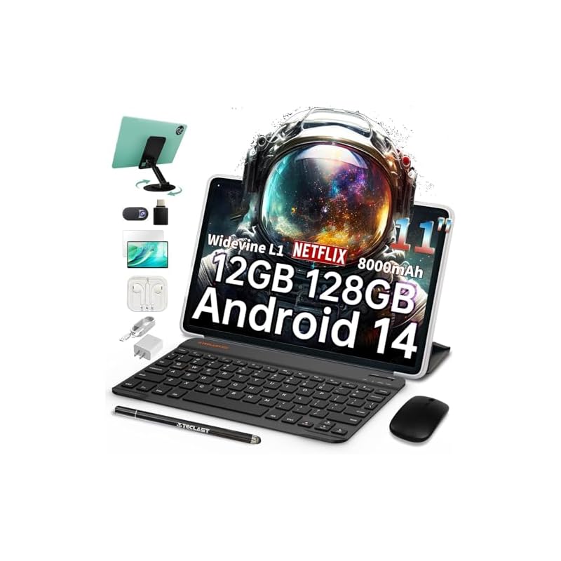 [Satisface todas tus necesidades] El P50S funciona con el sistema Android 14 completo y está equipado con un procesador T606 de ocho núcleos para un rendimiento suave y multitarea sin esfuerzo. Además, hemos emparejado el P50S con diez accesorios, incluyendo un soporte giratorio de 360°, teclado Bluetooth, mouse inalámbrico, lápiz óptico, cubierta de cámara, funda protectora, auriculares con cable, convertidor OTG, protector de pantalla HD (preaplicado) y un cargador. Ya sea que estés en la cocina, oficina o cafetería, puedes utilizarlo fácilmente. [Pantalla de 11 pulgadas + Widevine L1] El P50S cuenta con una pantalla de 11 pulgadas con 350 nits de brillo y certificaciones para luz azul baja y Widevine L1. Ya sea que seas un fan dedicado o alguien que ama ver programas compulsivos, puedes disfrutar del último contenido certificado Widevine L1 en Netflix, YouTube, HBO o Amazon Prime Video en resolución de 1080p. Además, ayuda a proteger tu vista y evita la fatiga ocular. [Hasta 12 GB de RAM + 128 GB de ROM + 1 TB ampliable] La tableta Android P50S está equipada con 12 GB de RAM (4 GB + 8 GB de memoria expandible) y 128 GB de ROM de alta velocidad, ofreciendo una excelente experiencia multitarea. Puedes trabajar, estudiar, leer o ver películas fácilmente en la tableta. El P50S es compatible con tarjetas Micro SD/TF de 1 TB de cualquier marca, proporcionando un amplio espacio para almacenar contenido audiovisual, libros electrónicos, fotos y videos sin preocuparte por el almacenamiento. [Batería de 8000 mAh + cámaras duales + micrófonos duales] El P50S funciona con una batería eficiente de 8000 mAh, que, combinada con el sistema operativo Android 14 de bajo consumo, soporta hasta 11 horas de reproducción de video local, 7 horas de videollamadas y 11 horas de disfrute de música. Además, el P50S cuenta con una matriz de micrófono dual para un audio más claro durante las reuniones. Esta tableta de 11 pulgadas también es compatible con Wi-Fi 2.4G/5G y viene con una cámara frontal de 5 MP y cámara trasera de 13 MP, con funcionalidad de desbloqueo facial.