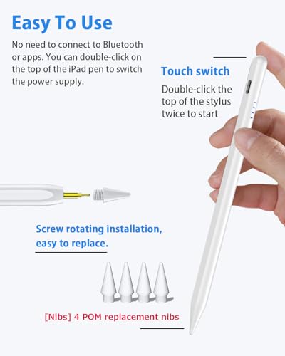 Función de inclinación/punta de repuesto POM: el lápiz óptico se puede basar en tus diferentes ángulos de escritura, grabado con diferentes grosores de sombra de línea, alta precisión para restaurar la escritura real del lápiz. La punta del lápiz óptico utiliza una punta de material POM duradera, que reduce eficazmente los arañazos en la pantalla electrónica durante la escritura. Puntas – Para prolongar la vida útil del bolígrafo, nuestro juego de lápices para iPad Pro incluye 4 puntas de repuesto del mismo grado, lo que ahorra mucho costo para los usuarios de bolígrafos de alta frecuencia