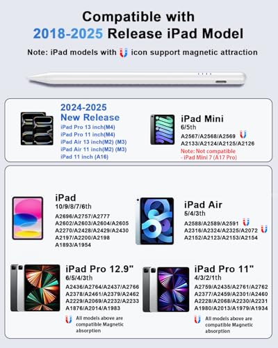 Solo compatible con iPad: este lápiz iPad solo es compatible con Apple iPad Air 2018-2025 de 11 pulgadas y 13 pulgadas (M2) (M3), iPad Pro de 11 pulgadas y 13 pulgadas (M4), iPad 6/7/8/9/10/11 (A16) Gen, iPad Pro de 11 pulgadas 1/2/3/4 Gen, iPad Pro 30 EU pulgadas 3/4/5/6 Gen, iPad Air 3/4/5 Gen, iPad Mini 5/6 Gen.【Nota】Este lápiz no es compatible con modelos anteriores a 2018 y no funciona con dispositivos iPhone, Android y Microsoft. Antes de comprar, asegúrate de comprobar el modelo en la parte posterior del iPad