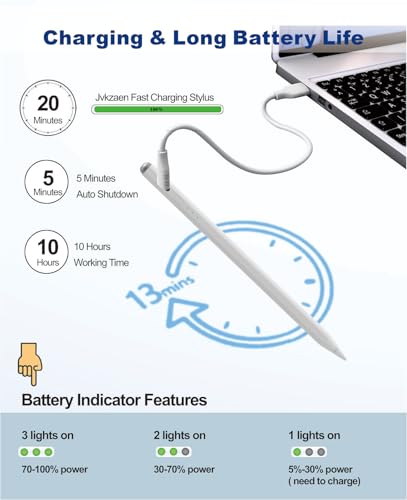 Carga rápida y visualización de energía: carga durante solo 14 minutos y disfruta de L. a. friolera de 10 horas de uso ininterrumpido. Este lápiz para iPad también cuenta con 3 indicadores LED para mostrar L. a. duración restante de L. a. batería y el progreso de carga. Y no hay uso de L. a. función de apagado automático en 5 minutos, ahorrando energía. (NOTA: L. a. carga inalámbrica no es Appropriate)