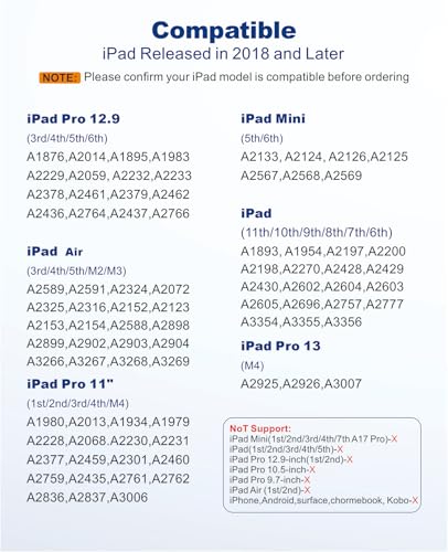 Compatibilidad: este lápiz para iPad está diseñado exclusivamente para iPad lanzado en 2018 y posteriores. Appropriate con los siguientes modelos: iPad 11ª/10ª/9ª/8ª/7ª/6ª generación, iPad Professional eleven» (todas las generaciones), iPad Professional 12.nine» (3ª a 7ª generación), iPad Professional M4, iPad Mini 5ª y 6ª generación y iPad Air M2/5ª/4ª/3ª generación. Antes de comprar, comprueba el modelo de tu iPad en [Ajustes > General > Acerca de]. No apto para otras versiones de iPad o dispositivos de pantalla táctil de otras marcas