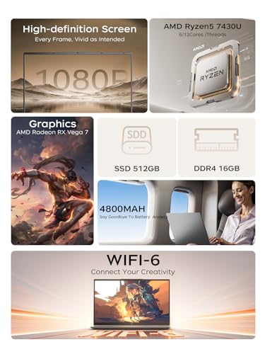 Especificaciones: Laptop con procesador AMD Ryzen 7430U Hexa-core (hasta 4.3G, Beat i5-1335U), gráficos AMD Radeon, SSD NVMe DDR4 de 16 GB de 512 GB, Wi-Fi 6, tipo C, cámara web, pantalla IPS Full HD de 15.6