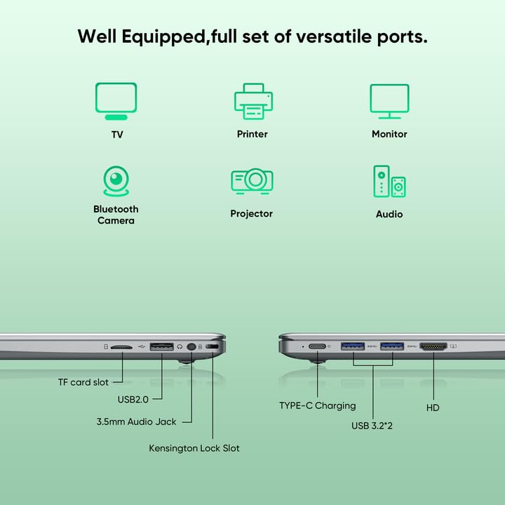 [Conexión sin problemas] Manténgase conectado con el soporte de esta computadora portátil para WiFi 5 y Bluetooth 5.0. Proporciona una selección de puertos versátil que incluye: 2 USB 3.2, 1 HDMI 1.4, 1 USB 2.0, 1 conector combinado de auriculares/micrófono, 1 lector de tarjetas TF (MicroSD) y 1 ranura Kensington Lock para mayor seguridad física. Este portátil Win 11pro le permite conectar monitores, unidades externas, periféricos y proteger el dispositivo en espacios compartidos.