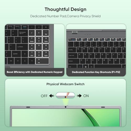 Pantalla inmersiva, máxima protección de privacidad: esta laptop Win11 Pro cuenta con una pantalla IPS de 15.6 pulgadas de 1080p para una claridad vibrante, perfecta para películas, presentaciones, edición de documentos y navegación web, todo con detalles nítidos y reducción de la fatiga ocular. La cámara frontal ubicada en el centro incluye un obturador de privacidad física, por lo que tiene control total sobre su privacidad durante las fotos y las videollamadas.