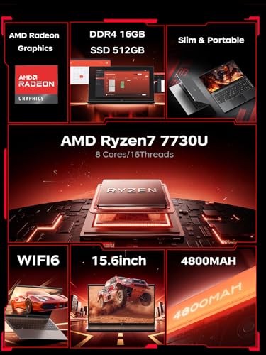 Especificaciones: Laptop para juegos, portátil de 15.6 pulgadas con AMD Ryzen 7 7730U (8C/16T, hasta 4.5GHz), 16 GB de RAM 512 GB NVMe SSD Windows 11 de alto rendimiento, hasta 2 TB, gráficos Radeon RX Vega 8