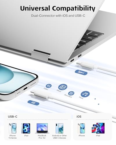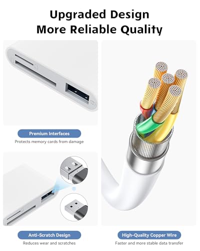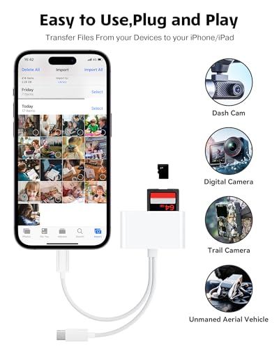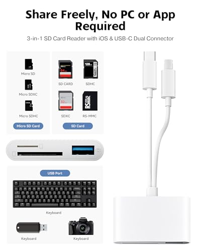 Diseño de doble conector (conector iPhone y USB-C): este lector de tarjetas SD cuenta con un conector iPhone y un conector USB-C, lo que le permite trabajar con una amplia gama de dispositivos, incluidos iPhone 5 a 14 collection, así como USB-C iPhone 15 y 16, iPad, MacBook, computadoras Mac, computadoras portátiles y dispositivos Android.