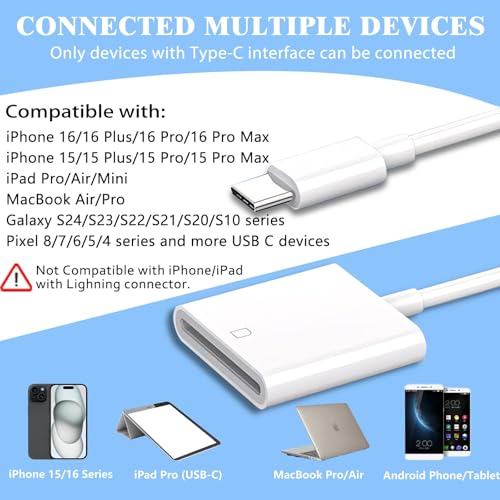 Amplia compatibilidad: el lector de tarjetas SD USB C para iPhone es suitable con una amplia gama de dispositivos USB tipo C. Incluyendo iPhone 17/17 Professional/17 Professional Max, iPhone sixteen/sixteen Plus/sixteen Professional/16Pro Max, iPhone 15/15 Plus/15 Professional/15Pro Max, iPad Professional 2020/2018/M1 2021/Air 5 2022/Air 4 2020/mini6, Galaxy S24/S23/SSS23/S23/S23. 50 ES/S 1/S20/Notice 10/Notice 20, MacBook Air M1/Professional M1 y más dispositivos USB tipo C.