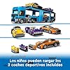 Divertido complemento para cualquier colección de coches de juguete: los peques pueden inclinar la cabina del conductor para acceder al motor, enganchar el remolque y bajar las rampas de las plataformas para cargar los 3 coches de juguete