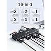 Estación de acoplamiento USB C 10 en 1: con esta estación de acoplamiento, puedes extender fácilmente un puerto USB tipo C a dos monitores 2 HDMI, VGA, 1 puerto USB 3.0 y 2 puertos USB 2.0, puerto de carga de alimentación USB C (máximo 100 W), lectores de tarjetas SD/Micro SD y micrófono/audio de 0.138 in. Además, esta base de rayo no necesita instalar ningún controlador, simplemente enchufa y lista, satisface completamente tu uso diario