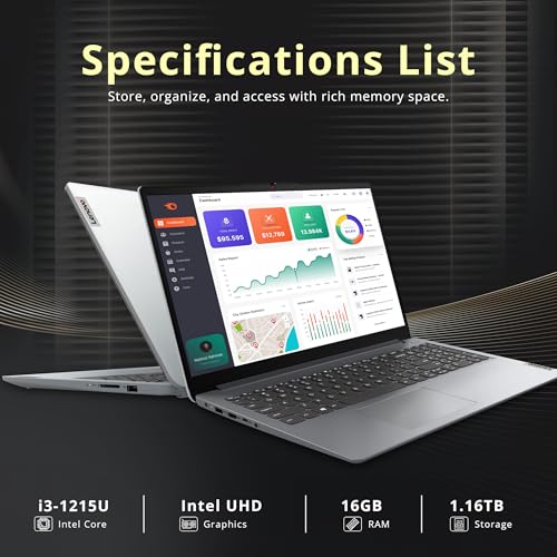 Especificaciones: Lenovo Ideapad 1i – Laptop con pantalla táctil FHD de 15.6 pulgadas, Intel i3 1215U, 16 GB de RAM, 1.16 TB de almacenamiento (1 TB SSD + 160 GB de estación de acoplamiento), gráficos Intel UHD, teclado de tamaño completo, Win11 Pro, gris