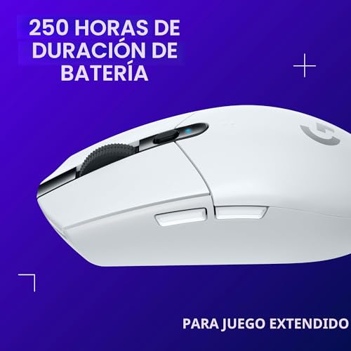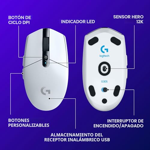 Especificaciones: Logitech G 305 Lightspeed – Mouse inalámbrico para juegos, sensor de héroe, 12,000 DPI, ligero, 6 botones programables, batería de 250 horas, memoria integrada, compatible con PC, Mac, color blanco