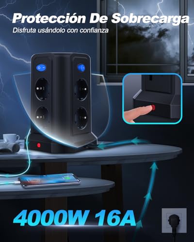 【Regleta 12 en 1】 Esta torre regleta tiene 8 tomas de corriente AC, admite una potencia de salida máxima de 4000 W y una intensidad de corriente de 16 A, que puede satisfacer las necesidades de la mayoría de los equipos eléctricos. Equipado con 4 puertos USB al mismo tiempo, puede permitir cargar hasta 12 dispositivos electrónicos al mismo tiempo, mejorando enormemente la comodidad de uso y la flexibilidad de administración de dispositivos.