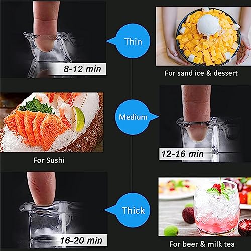 [La fabricación rápida de hielo ayuda mucho]: la máquina de hielo solo tarda de 12 a 16 minutos en hacer un lote de 32 cubitos de hielo cuadrados de cristal y hasta 40 kg (88 lb) de cubitos de hielo por día.La capacidad de almacenamiento de hielo es de 9 libras (427 cubitos de hielo transparentes).La máquina de hielo comercial también puede ajustar el grosor de los cubitos de hielo: (8-12 minutos para hielo fino), (12-16 minutos para hielo medio grueso), (16-20 minutos para hielo grueso) para