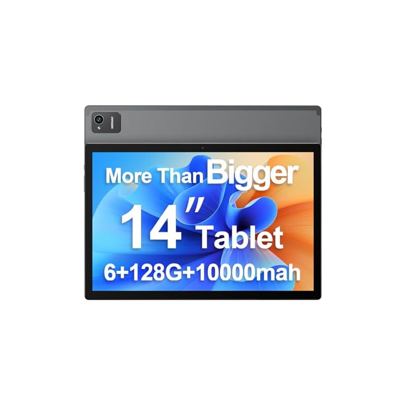 Especificaciones: MESWAO – Tableta de 14 pulgadas Android 14, tableta grande mejorada con tabletas de pantalla grande HD de 1080P, 8Core, 6GB+128GB, Wi-Fi 5, tarjeta TF de 512G, duración de la batería de 10000 mAh,