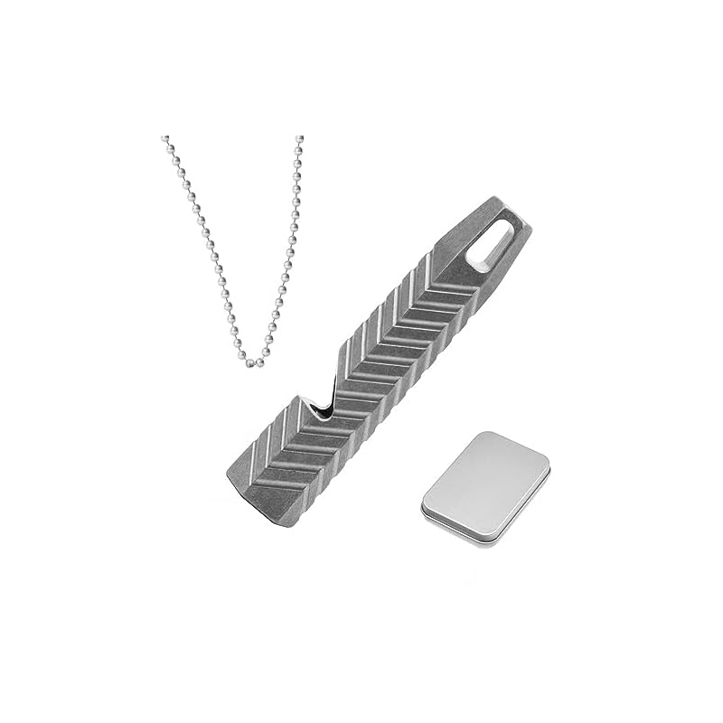 Especificaciones: MiOYOOW Mioyow silbato de titanio, silbatos de emergencia EDC silbatos al aire libre hasta 120 DB con cadena y caja de hierro para senderismo, caza, camping, pesca y aventura
