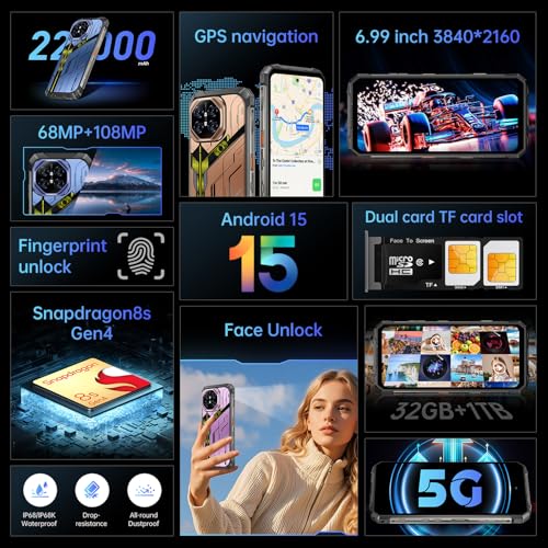 MMY Teléfono celular desbloqueado de 32 + 1 TB, 6.99 pulgadas, HD 68+108 MP, visión nocturna, fotografía, 22000 mAh, teléfono desbloqueado AI, identificación facial, desbloqueo de huellas dactilares