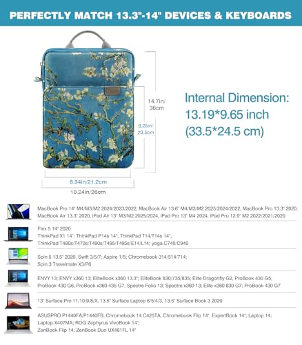 Compatibilidad: la funda está diseñada para laptops de 13.3 a 14 pulgadas. Compatible con MacBook Pro M3/M3 PRO/M3 MAX/M2 Pro/M2 Pro Max 14″ 2023, MacBook Pro 13″ M2 2022/Pro M1 Pro/M1 Max 14.2 2021, Nuevo MacBook Air 13.6″ M3/M2 2024/2022, MacBook Air Retina 13.3″, MacBook Air 13.3″, Surface Book 2/3 13.5″, Surface Laptop 1/2/3 13.5″, Surface Pro 9/8 13″, 14″Flex 4/Flex 6, Tab S8 Ultra 14.6″, Chromebook s330, Yoga 460/P40, ThinkPad E485/T480s, Ideapad 320S/330S/500/510S, Pavilion X360, etc.